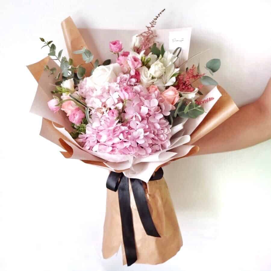 This garden bouquet features Roses, Alstroemeria, Ranunculuses, Astilbe, Freesia, Eustoma, foliage and Eucalyptus.