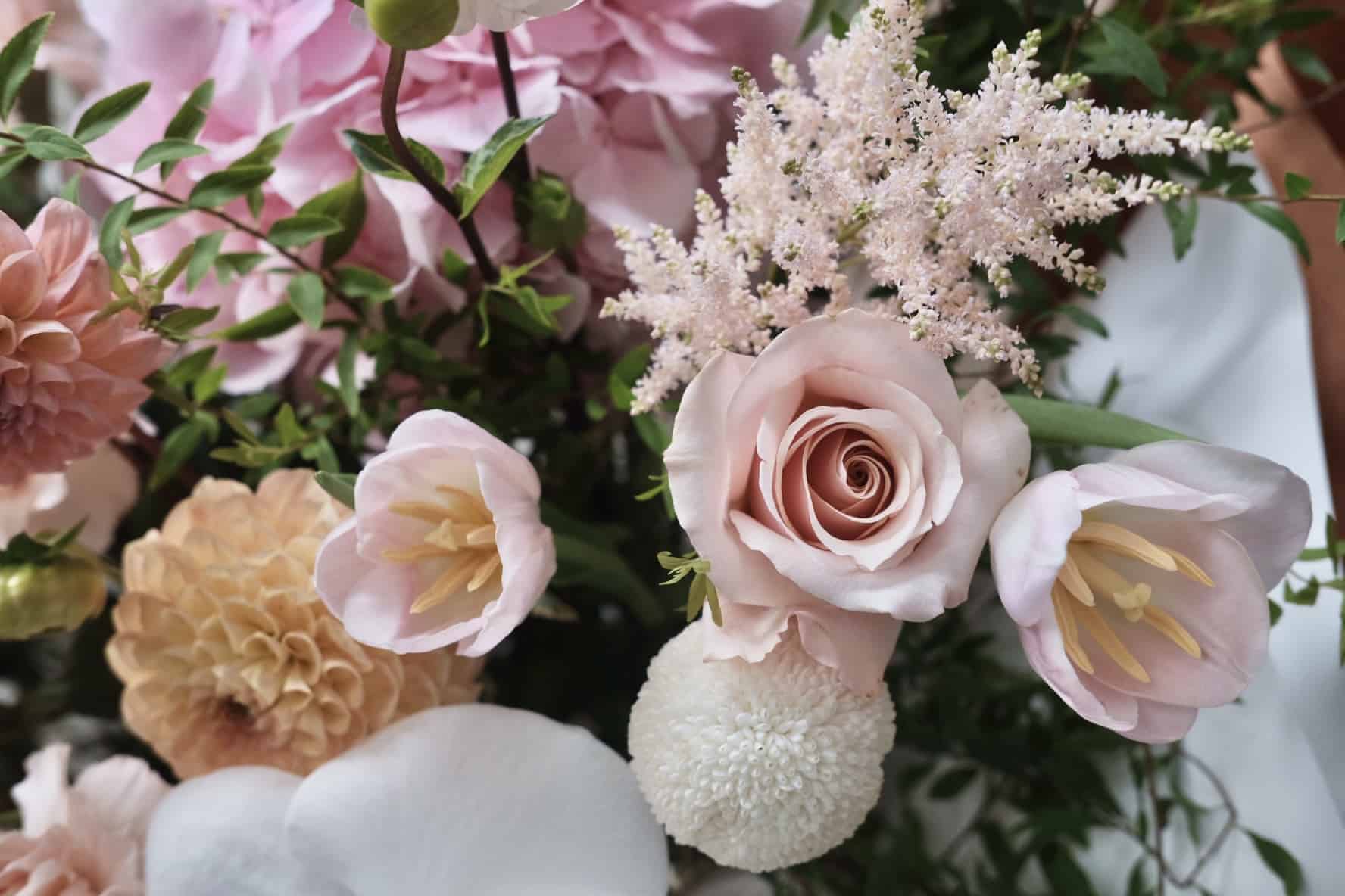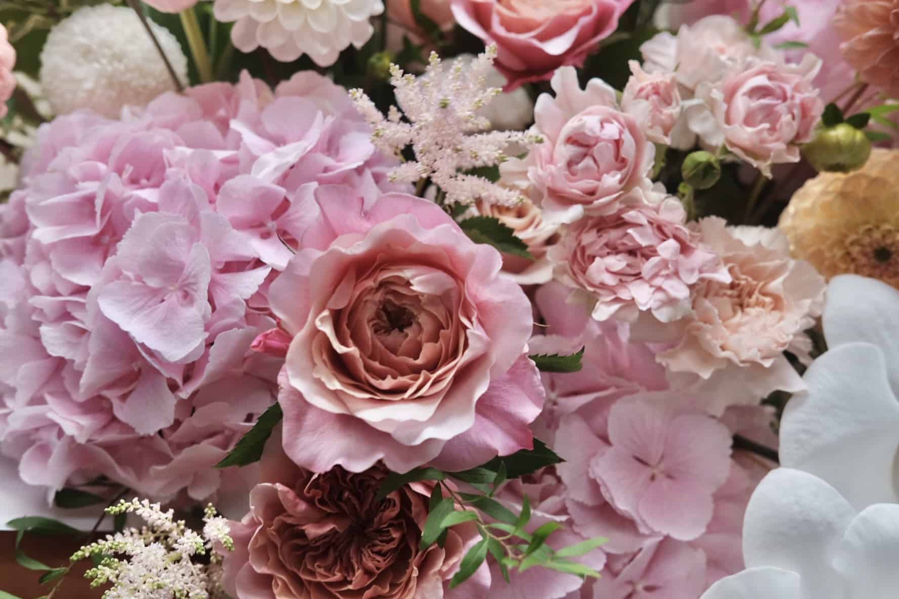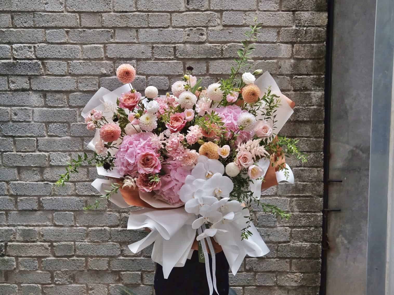 This XL garden style flower arrangement features Garden Roses, Phalaenopsis, Eustoma, Astilbe, Tulips, Dahlia, Roses Spray, Hydrangeas, Ping Pong, alongside with some other seasonal fillers flowers and greens.
