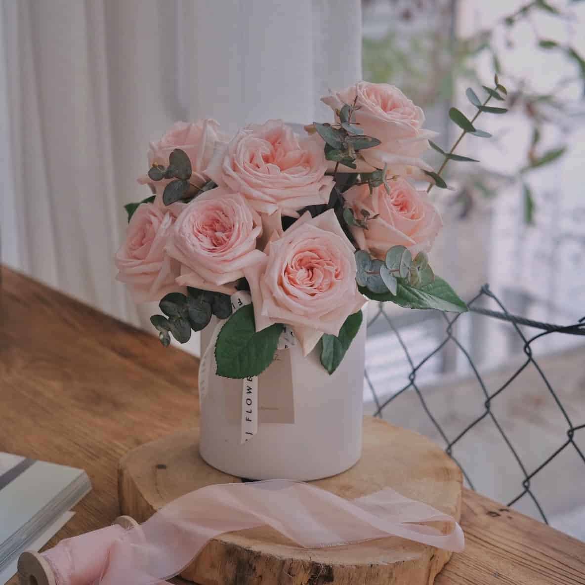 This arrangement features Scented Garden Roses with Eucalyptus.