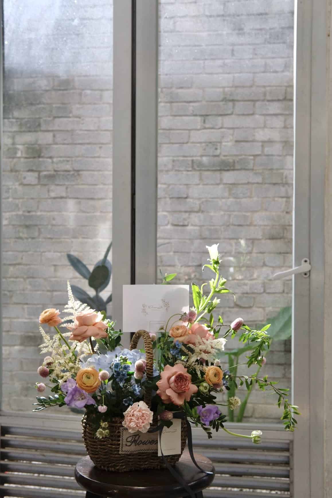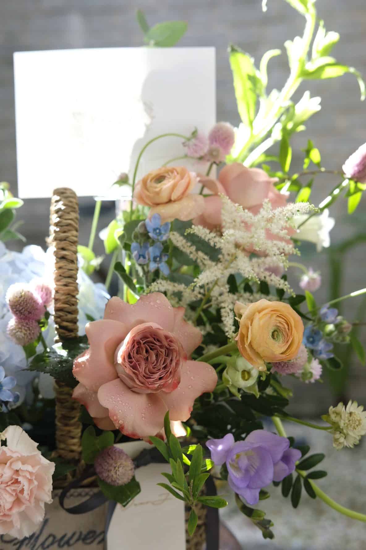 This whimsical flower basket arrangement features Hydrangea Kenya Cappuccino Roses, Ranunculus, Astilbe, Gomphrena, Oxypetalum, alongside with some other seasonal fillers flowers and greens.